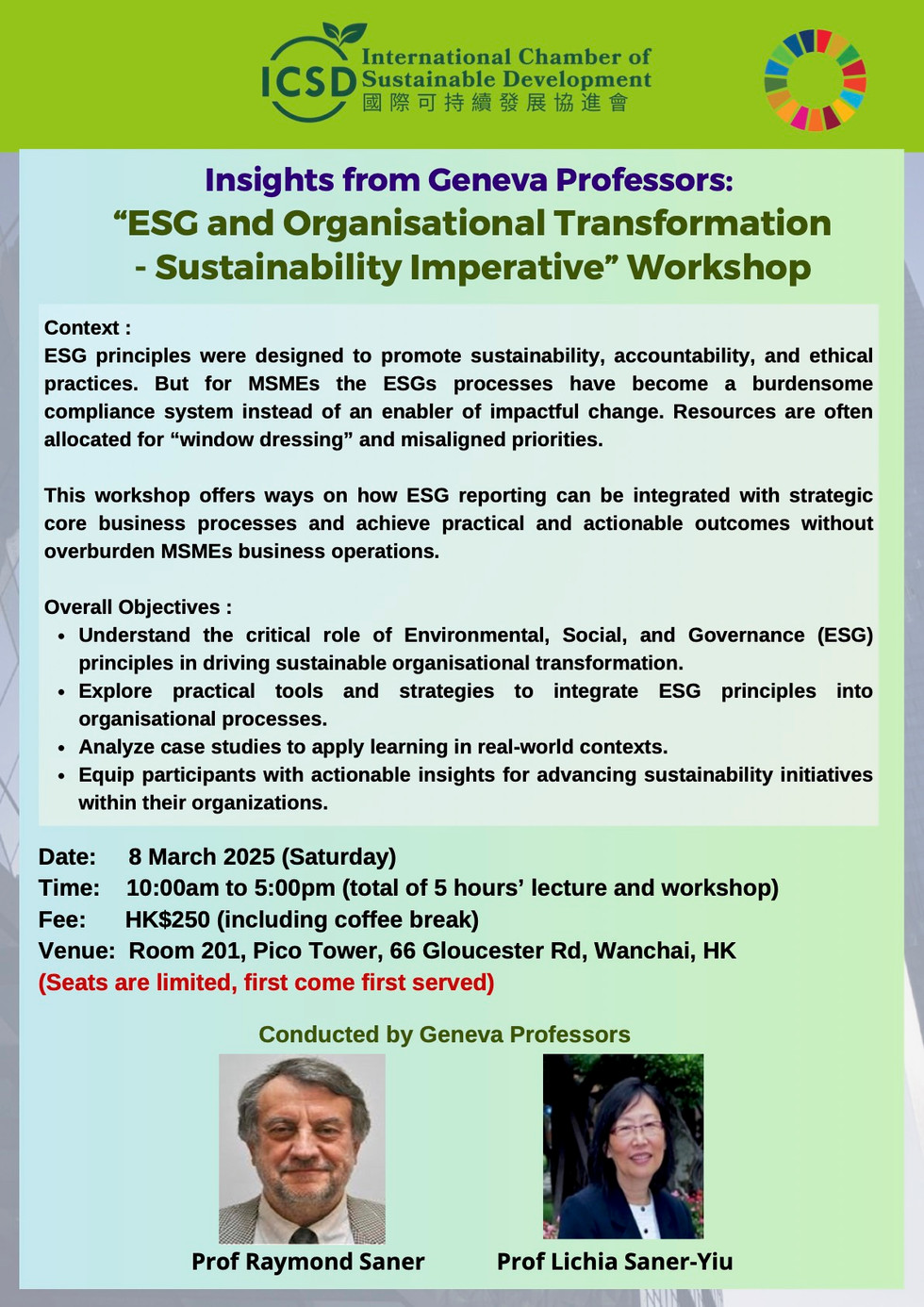 ICSDMar 81 min readUpdated: Mar 10On 8 March 2025, our two Geneva professors, Prof. Raymond Saner and Prof. Lichia Saner-Yiu, came to Hong Kong to conduct a one-day workshop for ICSD members. (Topic: ESG and Organisational Transformation - Sustainability Imperative)
