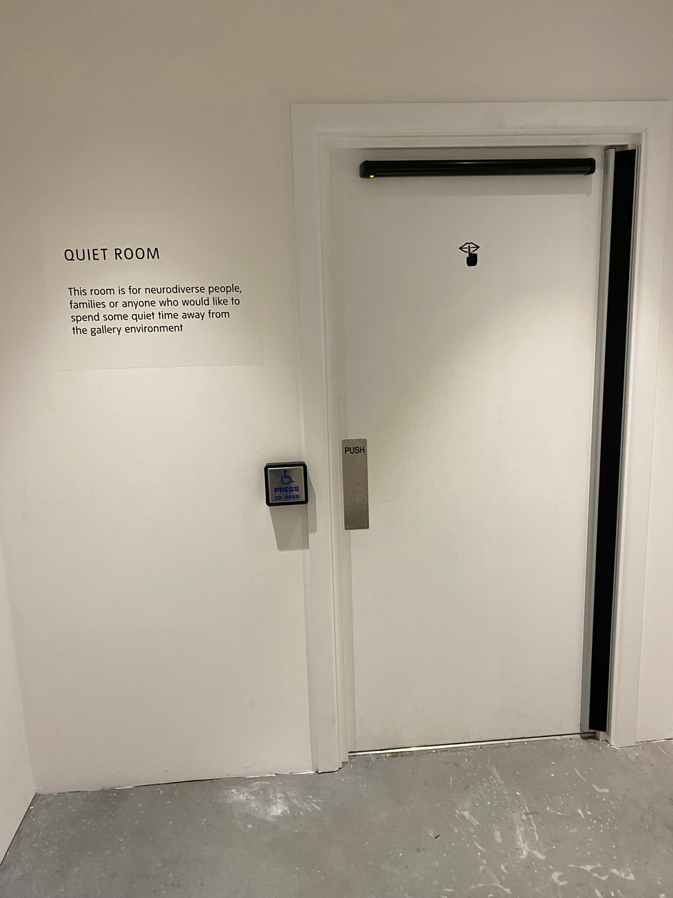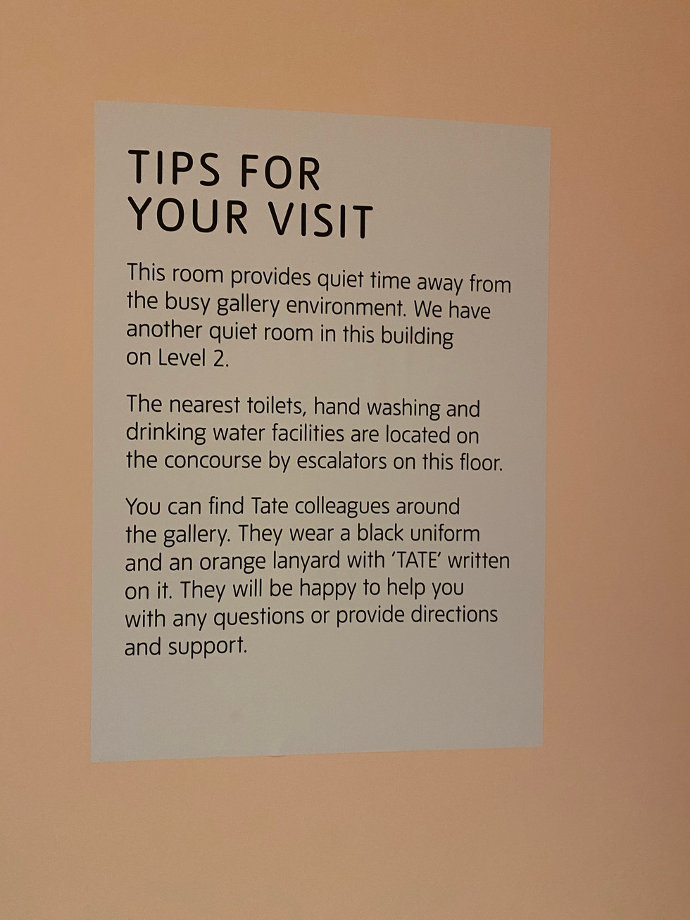 In practice, today Tate Modern in the U.K., one of the largest museums of modern and contemporary art in the world, provides "Quite Room" for the visitors in need to get away from the bustling environment (please see the attached photos).